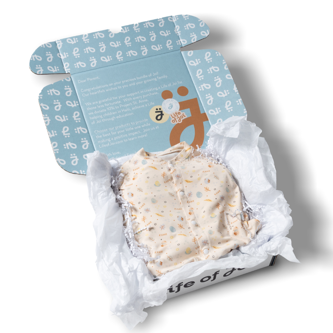 The Bundle of Joï is our signature baby essentials box, crafted with love, care, and softness for families everywhere. Our first theme is a beautifully crafted "Baby Dino Joï" story for both boy and girl babies! Each box includes six garments made from our ultra-soft viscose fabric, including 2 onesies (one short-sleeve and one long), a long-sleeve pajama set (pants and shirt), a matching bib and hat and finally our super soft and useful blanket.
